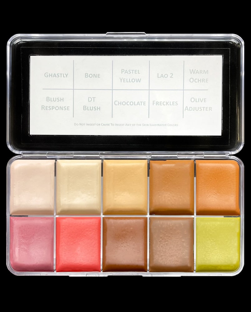 Adrian Rigby’s Bald Caps Palette is a custom collection of colors put together to collect all of Makeup Artist Adrian Rigby’s go-to Skin Illustrator colors for bald cap application in one spot. The collection consists of skin tones and adjusters for mixing a larger array of realistic flesh tones. The palette includes colors: Ghastly, Bone, Pastel Yellow, Lao 2, Warm Ochre, Blush Response, DT Blush, Chocolate, Freckles and Olive Adjuster.