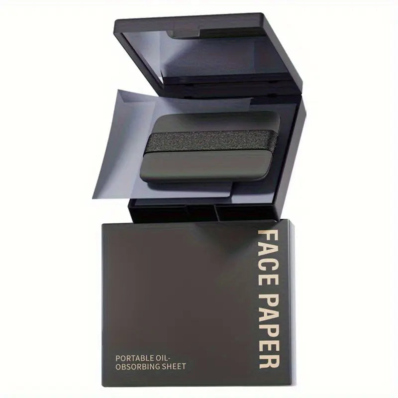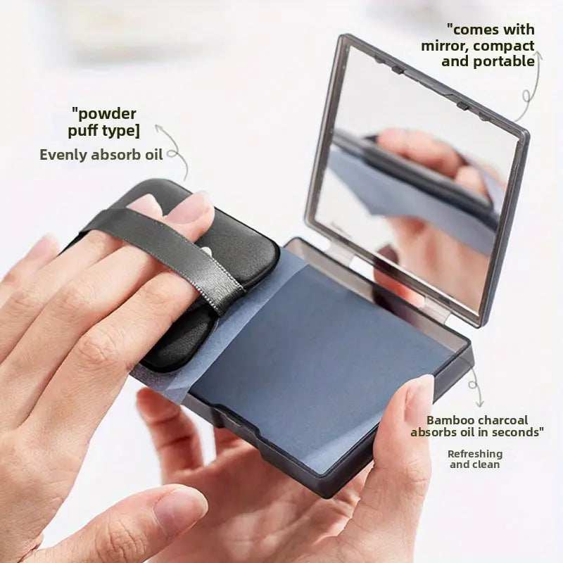 Compact case with 100 blotting sheets, application puff with replaceable adhesive pads, and integrated mirror. Designed for quick and hygienic shine control while on set or on the go.