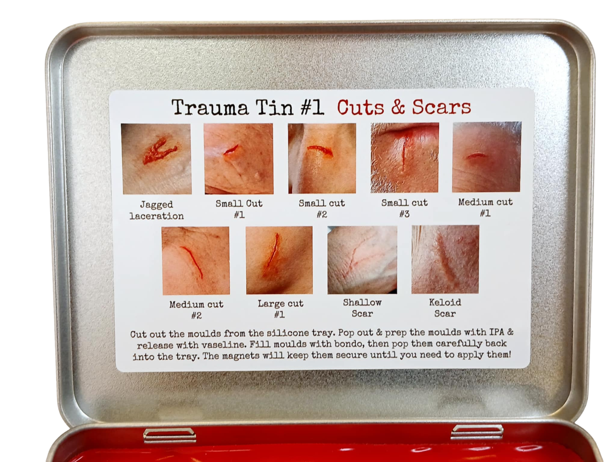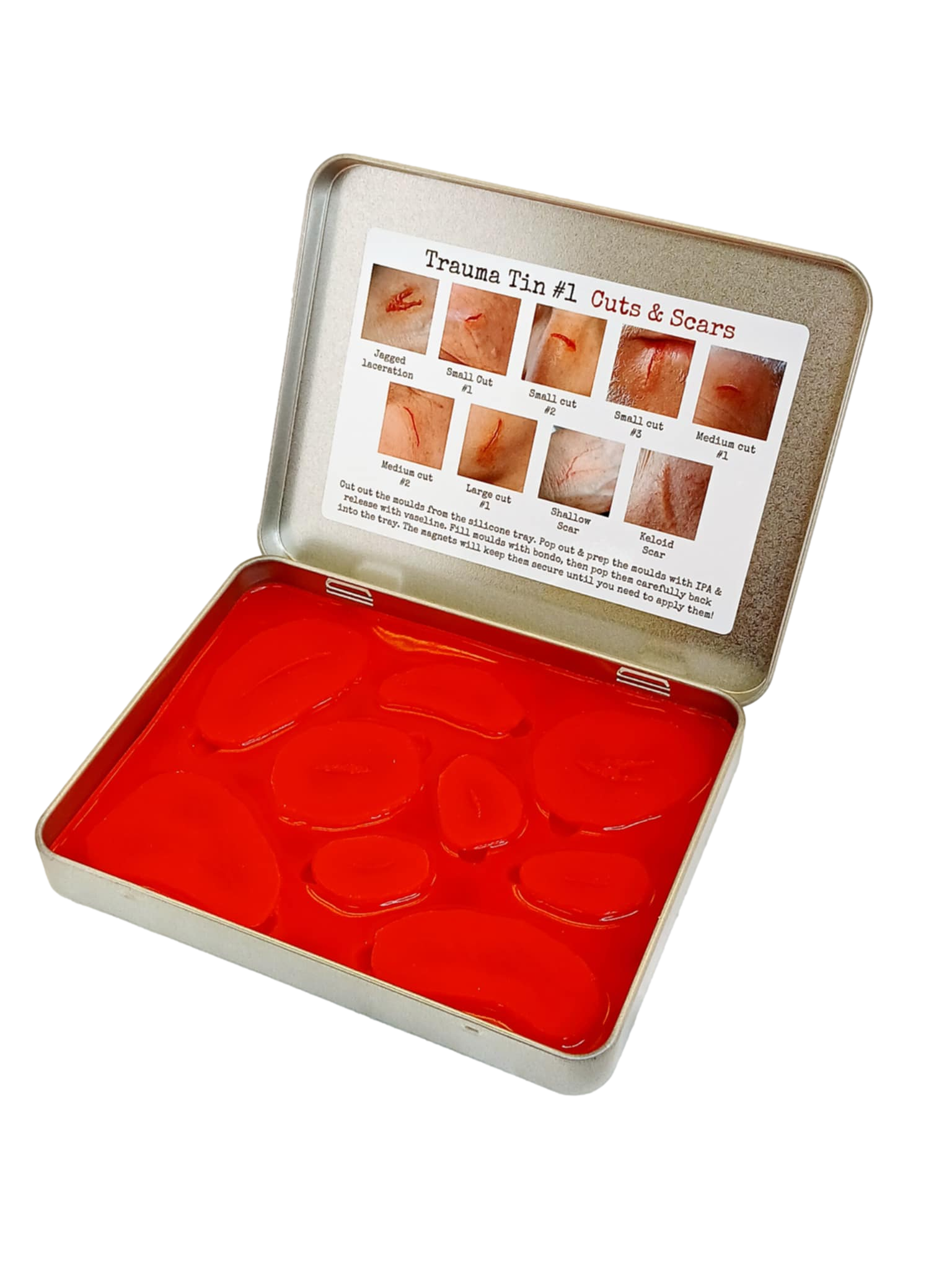 Trauma Tin #1 Cuts and scars comprises 9 magnetic silicone moulds which can be filled with Bondo (Prosthetic transfer material) or encapsulated silicone.